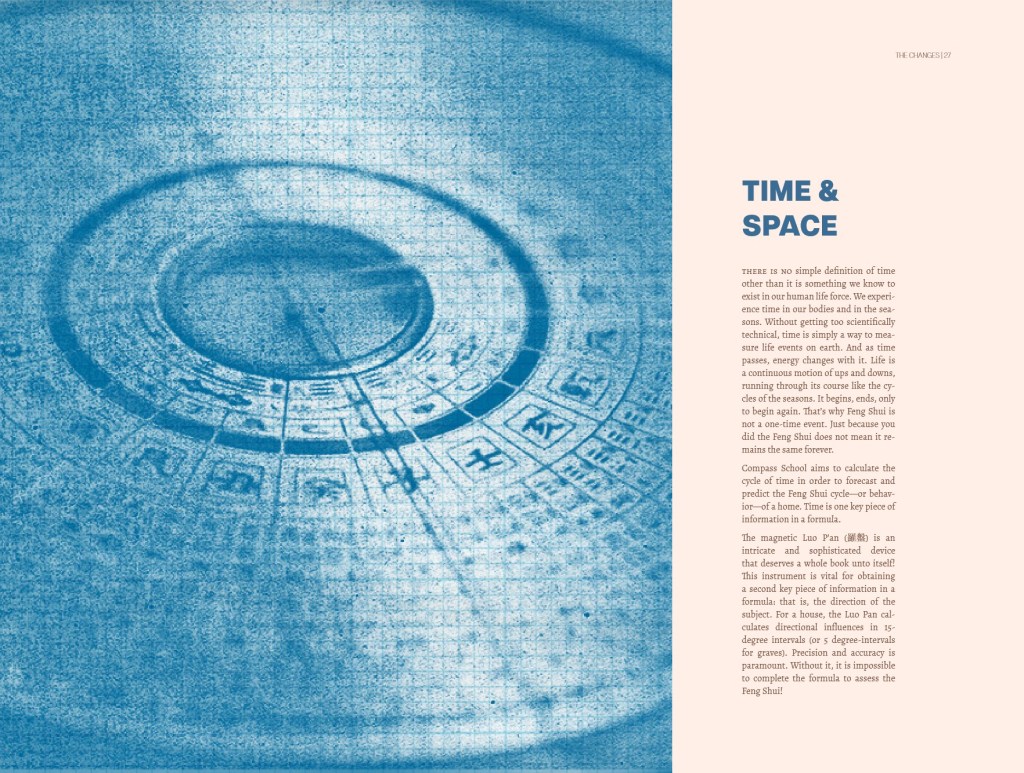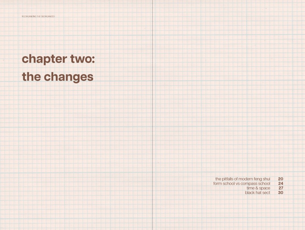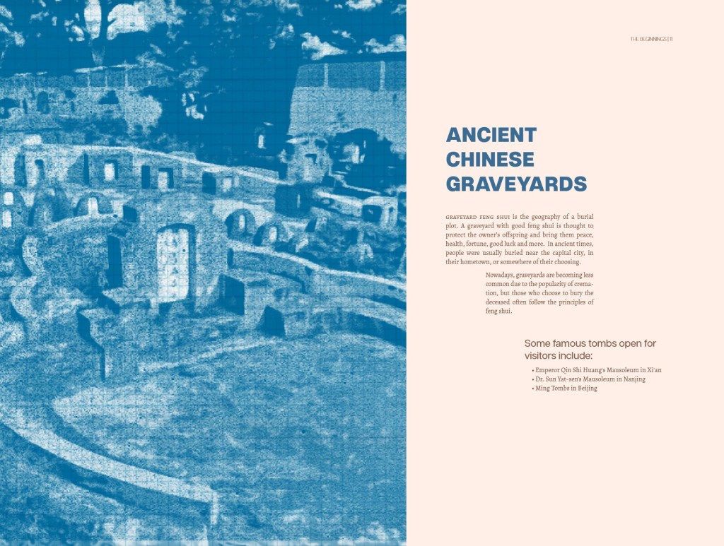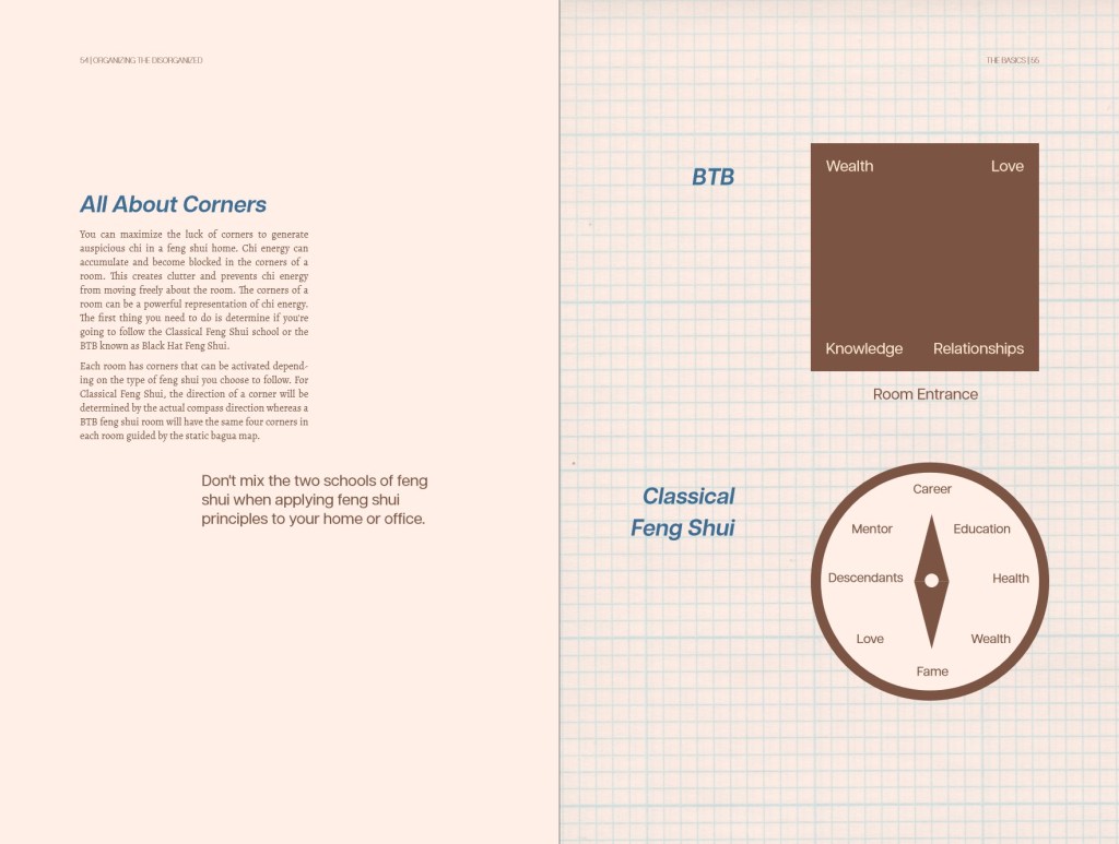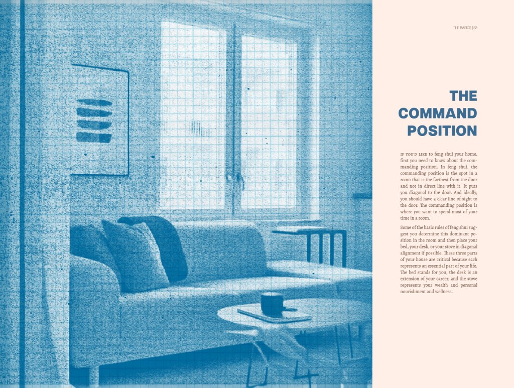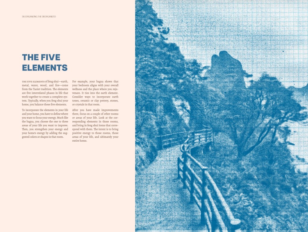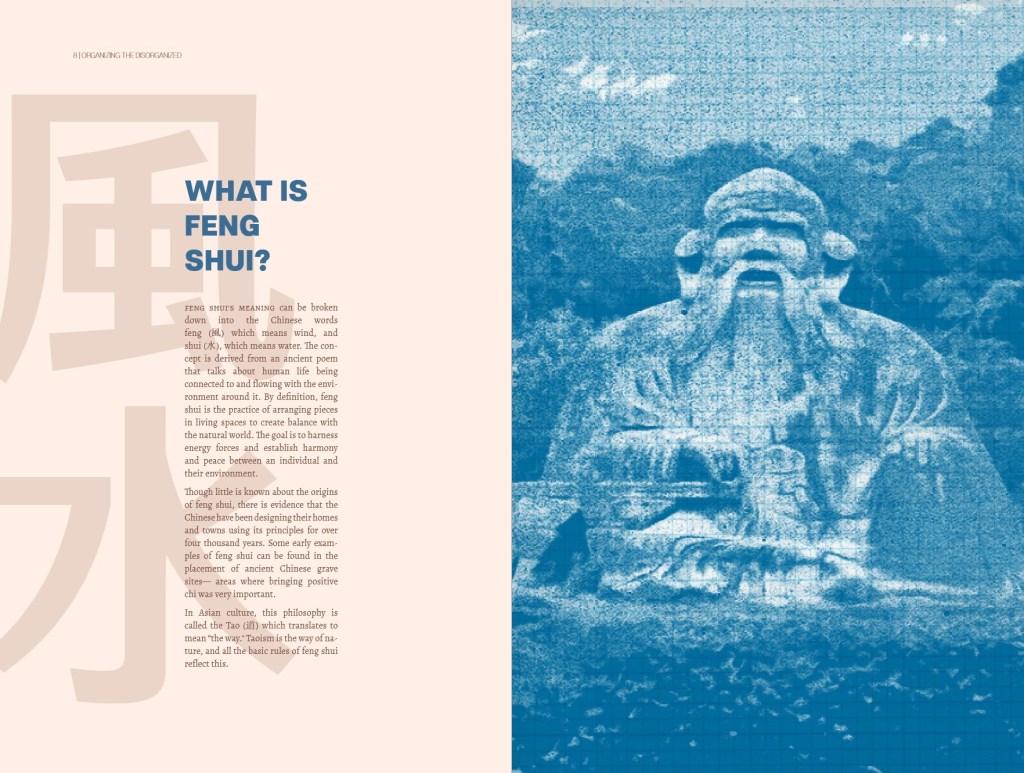 Throughout my book, I used a warm color palette of blue, yellow, cream, and brown to evoke a feeling of ancient and old knowledge, since feng shui is an ancient Chinese practice. The images throughout my book have a blue overlay with a grid to mimic house blueprints. The front and back covers as well as the chapter headers bring this grid back more visibly.