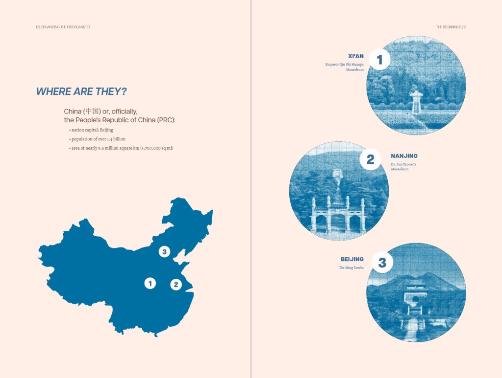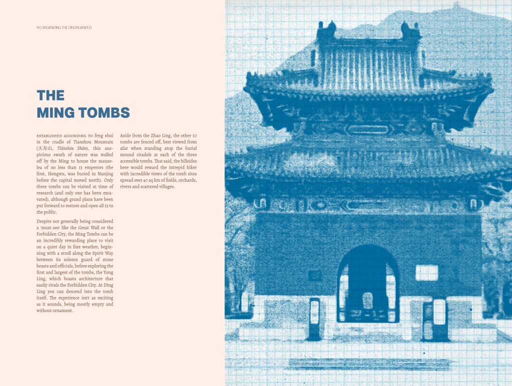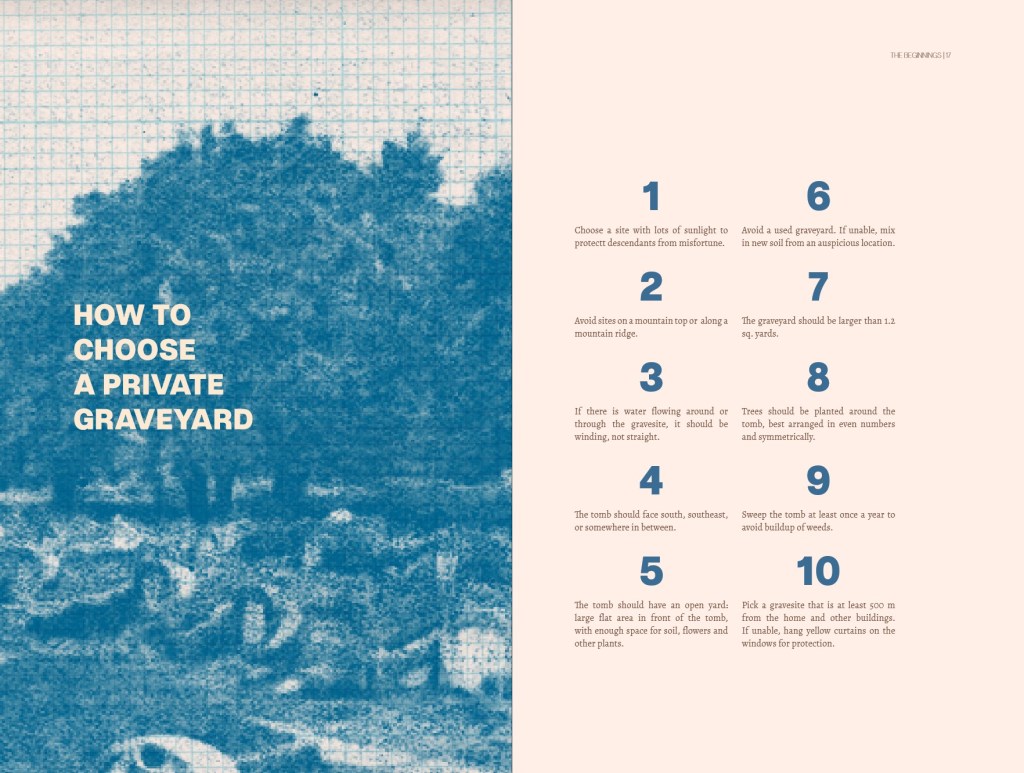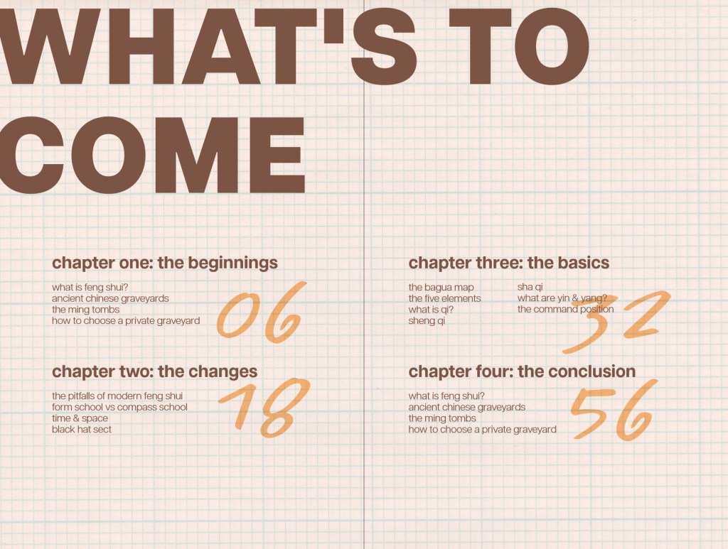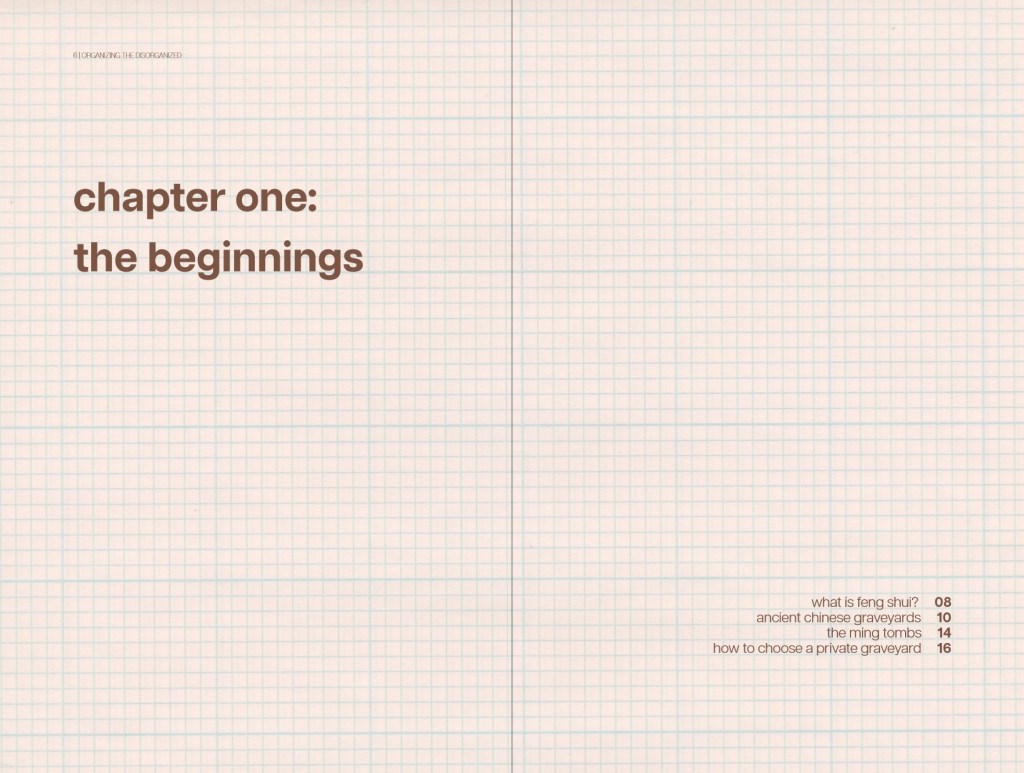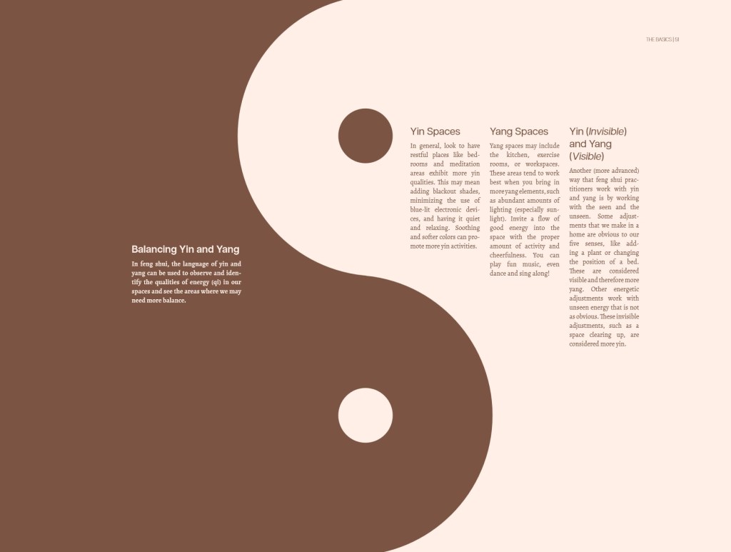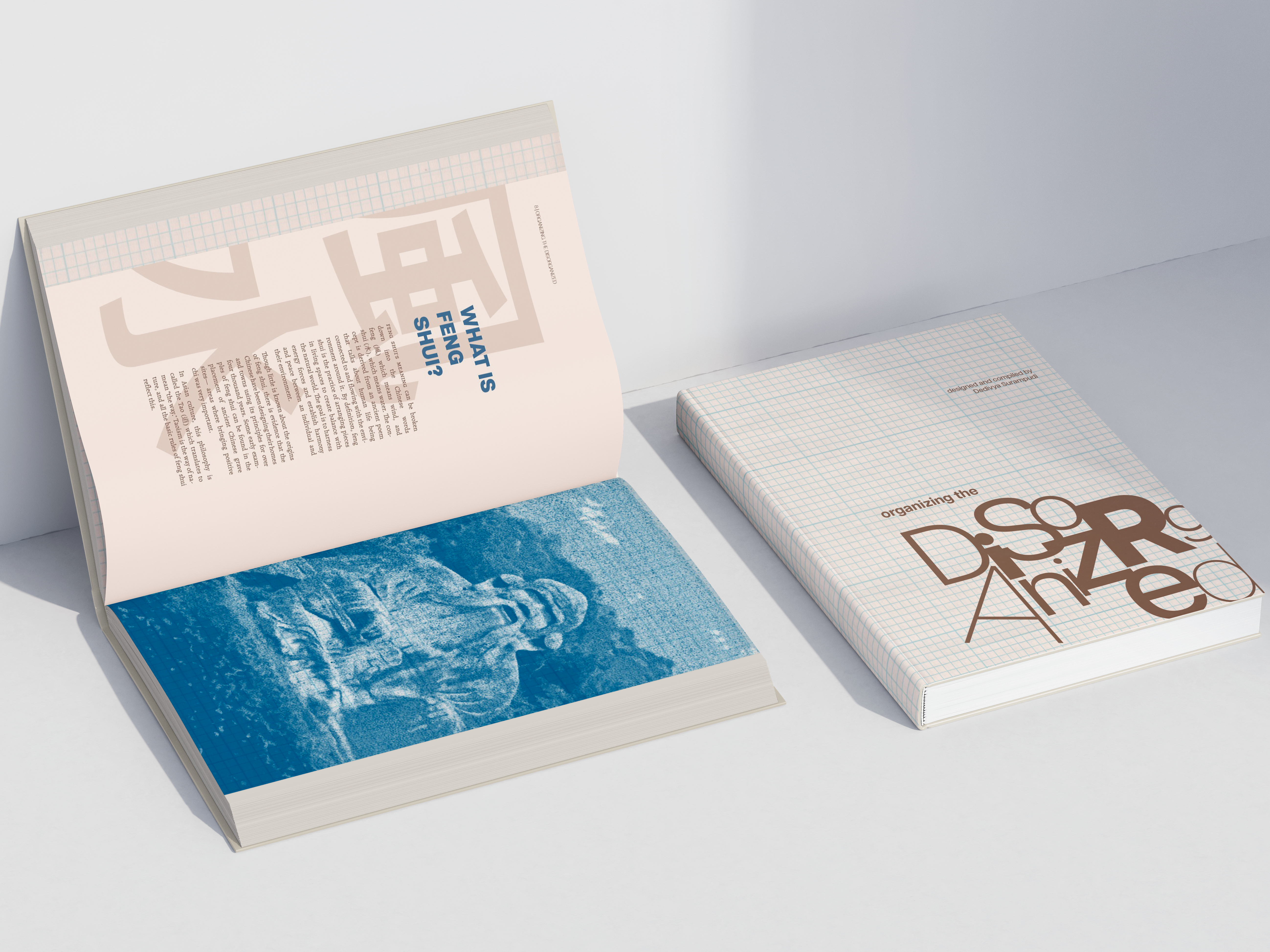 Throughout my book, I used a warm color palette of blue, yellow, cream, and brown to evoke a feeling of ancient and old knowledge, since feng shui is an ancient Chinese practice. The images throughout my book have a blue overlay with a grid to mimic house blueprints. The front and back covers as well as the chapter headers bring this grid back more visibly.